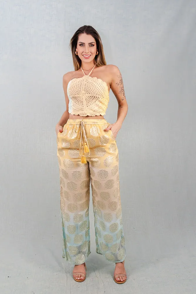 O Conjunto Sol Nascente, de Cropped e Calça Crepe em creme tie-dye, tamanho G, traz leveza e frescor, características marcantes de Ártemis.