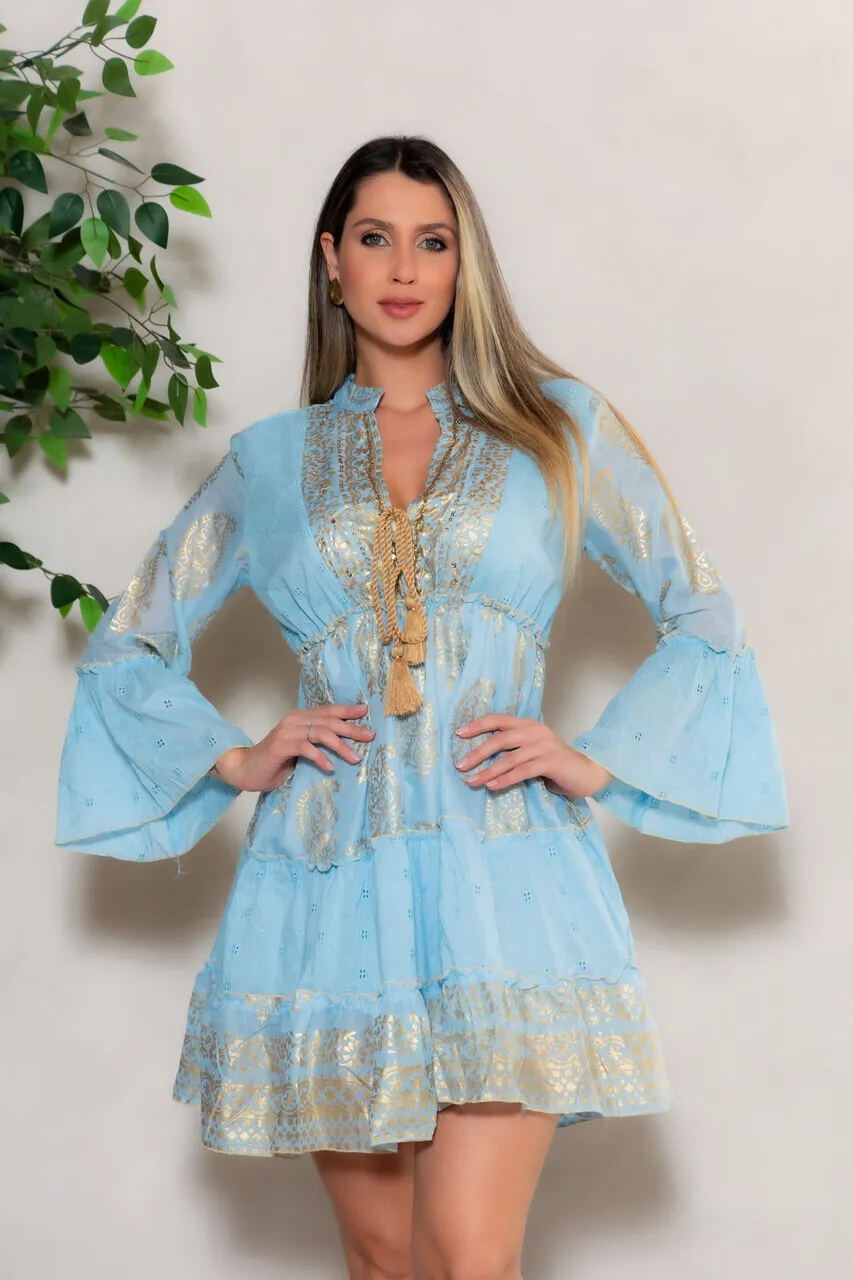 Descrição técnica: vestido vurto, vor azul céu, com estampa dourada, mangas longas, decote V com tassel e detalhes em dorado (estampa e paetê).
